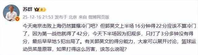 苏群在社交平台写道:“今天南京击败上海仍然算爆冷门吧?但郭昊文上半场16分钟得22分应该不算冷门了,因为第一战他就得了42分,今天下半场因为犯规多,只打了3分多钟没有得分,最后早早地5犯出局了。有关郭昊文的得分能力,大家可以展开讨论,篮球运动员菜是原罪,如果打得这么厉害,该怎么说呢?”